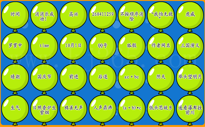 w0=14&w1=高兴|生气&w2=狐假|虎威&w3=time|时间&w4=晴朗|阴天&w5=三国演义|罗贯中&w6=(a+b)*c|ac+bc&w7=作者网名|“我怕无敌”&w8=QQ号|260411259&w9=国庆节|10月1日&w10=不按顺序消除|消消乐成功!&w11=前进|后退&w12=人声鼎沸|鸦雀无声&w13=日照香炉生紫烟|遥看瀑布挂前川&w14=举头望明月|低头思故乡&wt1=多媒体互式辅助课件--气球消消乐&wt2=请分别点击匹配的气球进行消消乐!&wsx=不顺序 w0参数为匹配消除的题条数量,可修改为5-14数字,本例为w0=14,显示14条消消乐匹配题干。还需修改w1 到w14 等号后面的匹配内容(如何匹配的内容不限定选取顺序wsx=不顺序,此默认选项,否则wsx=顺序,严格按着匹配顺序点击消除。),每一对匹配的题干内容必须用英文输入状态的“|”来分隔。其它参数不用修改,勿动。